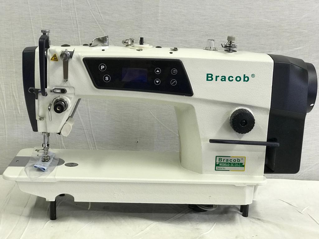 Máquina de costura industrial reta direct drive com posicionamento de agulha, para tecidos planos médios. Aplicação: costura de camisaria, pregar bolsos, reforço de costuras, etc.
